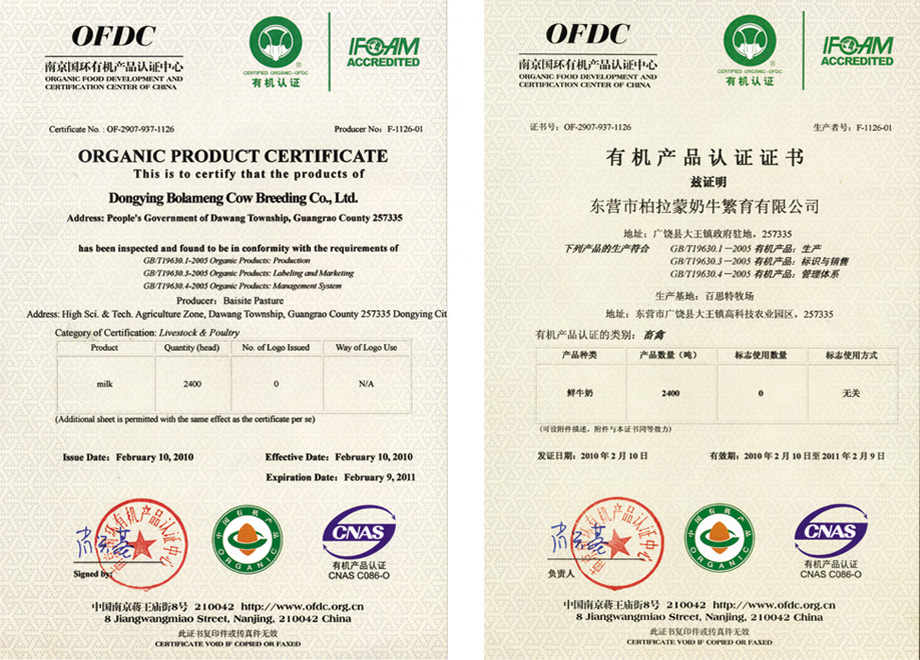 有(yǒu)機(jī)産品認證證書(shū)